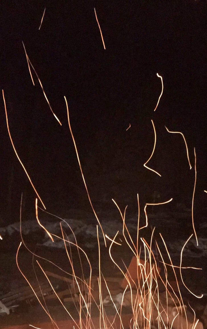 Fire is, perhaps, more enjoyable than it has ever been. I don’t remember the last fire I built, before the wild one raged through. That summer, I wondered if I’d ever enjoy fires again. Seven months later, there I sat more transfixed than I realized could be. Watching the embers race skyward. Each a little life running its course in fractions of seconds. Evidence of the transformative process that the heat, fuel, and oxygen I coaxed into this glowing cycle was making possible, even as it burned on top of a sheet of ice and snow. There was neither surprise nor relief that I was enjoying its heat on my skin. Just a depth of understanding between us, this fire and me, as though welcoming each other back to some sacred communion. Water and fire - these are my elements. Always transforming what they touch in large or small ways, slowly or quickly. Being at ease with both again felt like coming home.